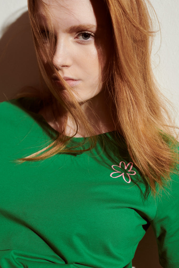 Das Balthasar T-shirt ist ein gerade geschnittenes T-shirt aus grasgrünem Bio Baumwoll-Jersey mit einer rosa Blumen Stickerei und kurzen Ärmeln.