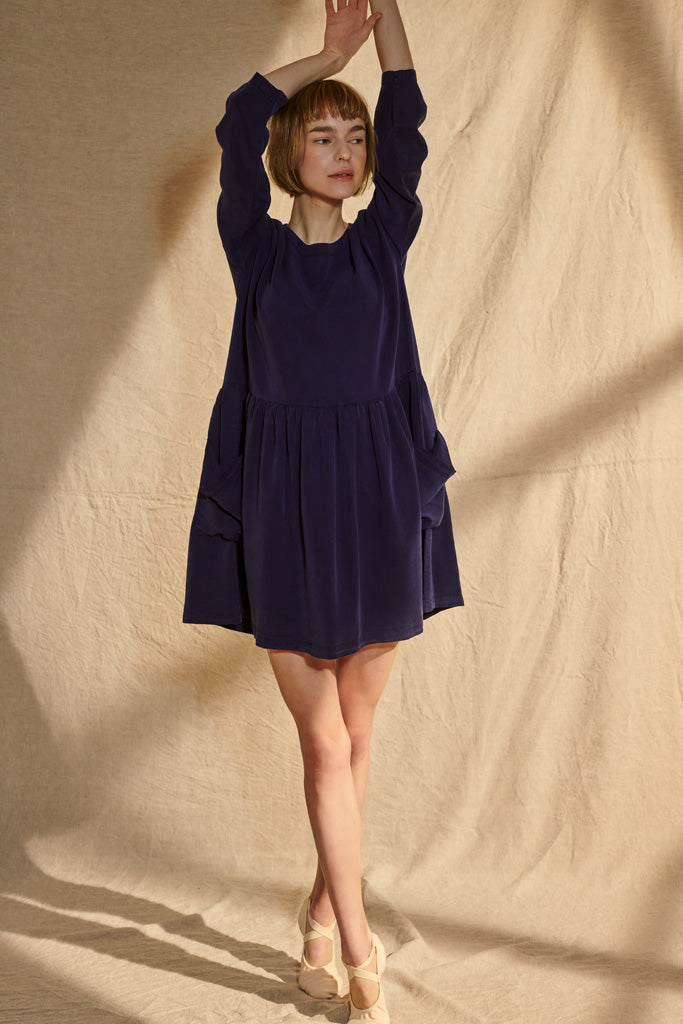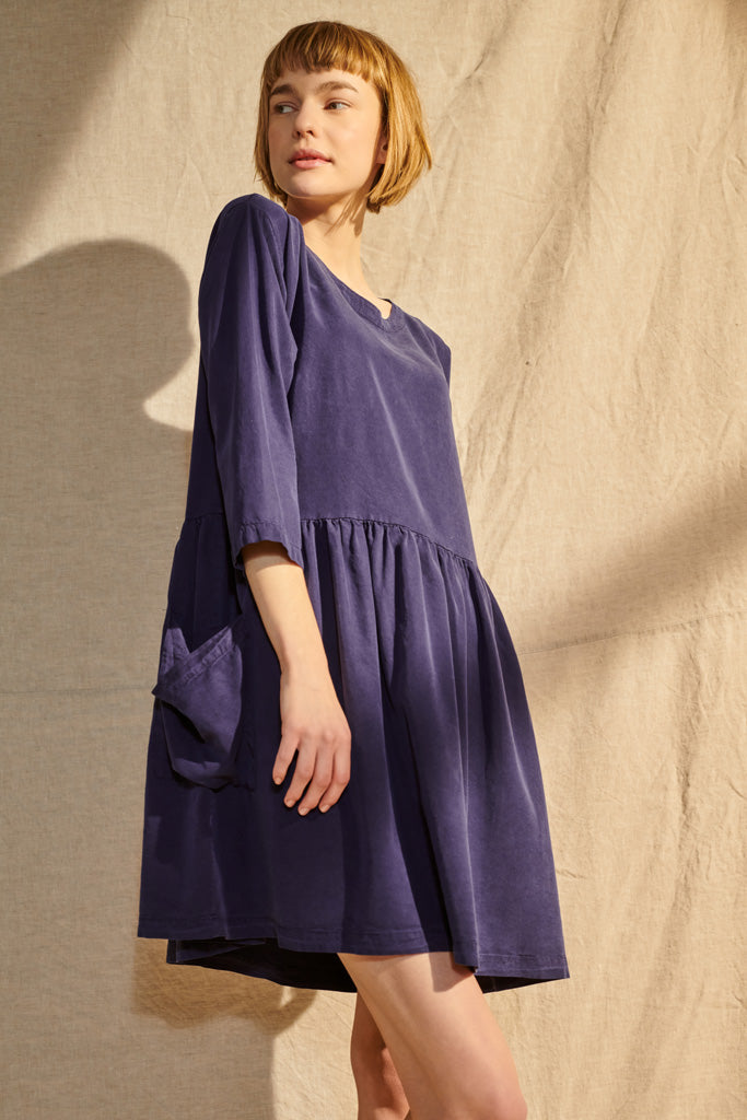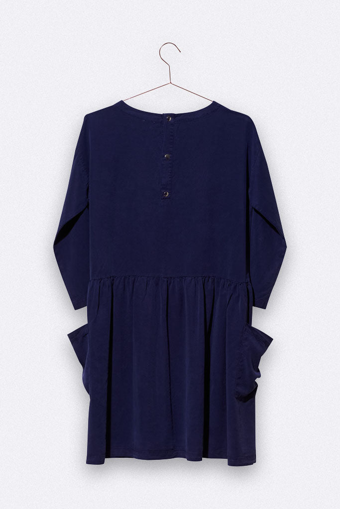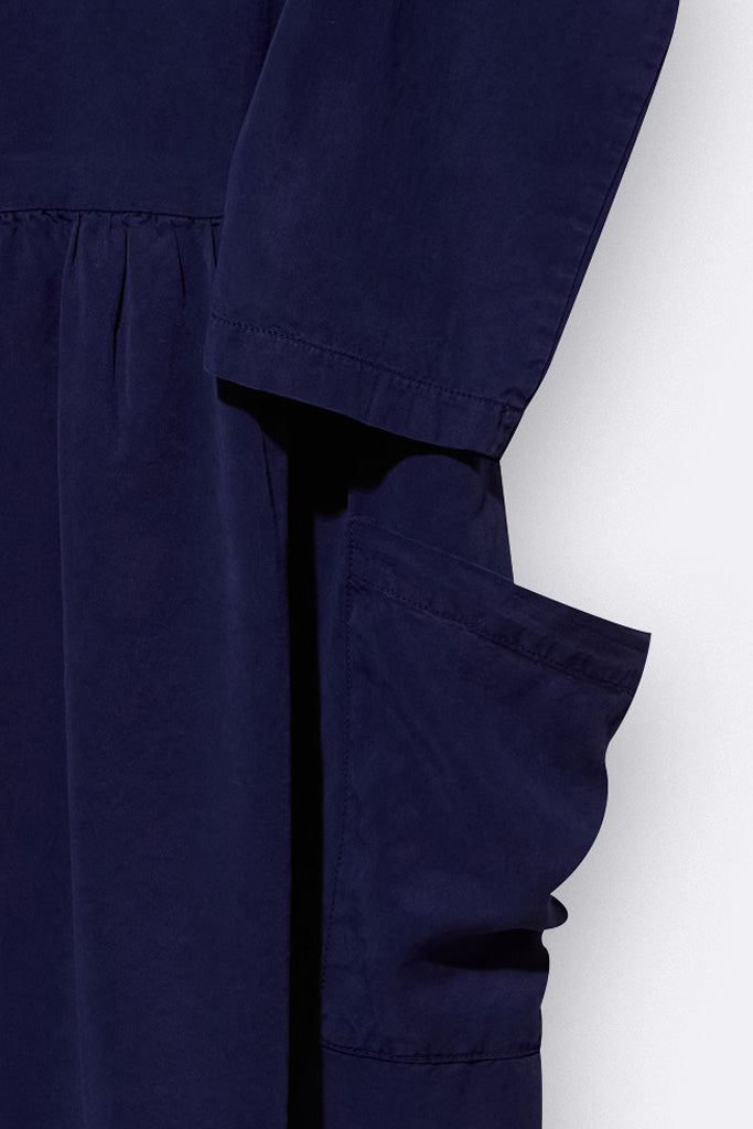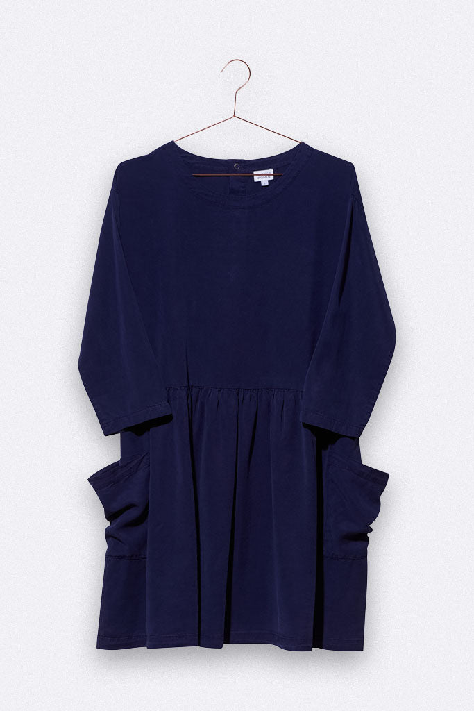 Das Lena Kleid hat einen geraden, weiten Schnitt und große aufgesetzte Taschen. Es ist aus dunkelblauem Tencel gefertigt.