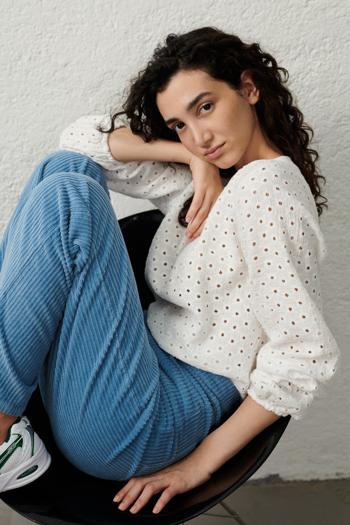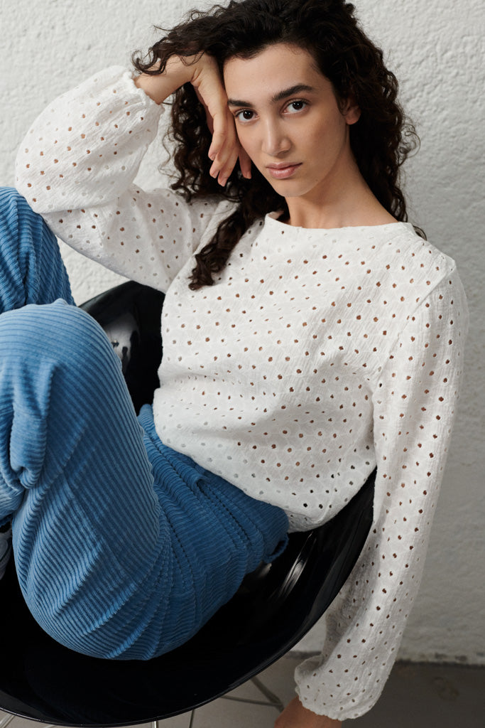 Die Phoebe Bluse ist aus weisser Broderie Anglaise gefertigt, hat einen lockeren Schnitt und glockige Ärmel.
