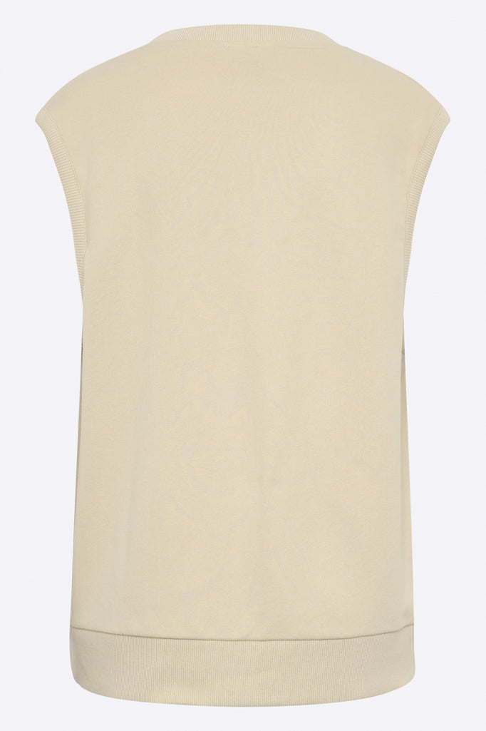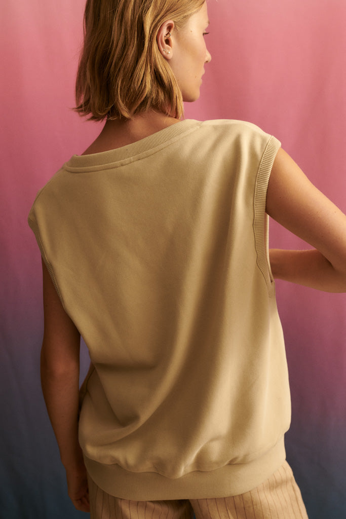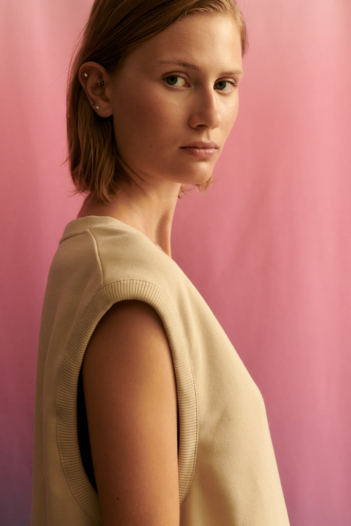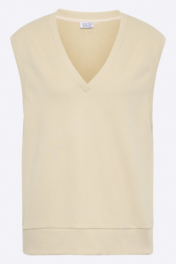 Der Tabea Pullunder ist aus Bio-Baumwoll Jersey in sandfarben gefertigt. Er hat einen oversized Schnitt und einen tiefen V-Neck Ausschnitt.