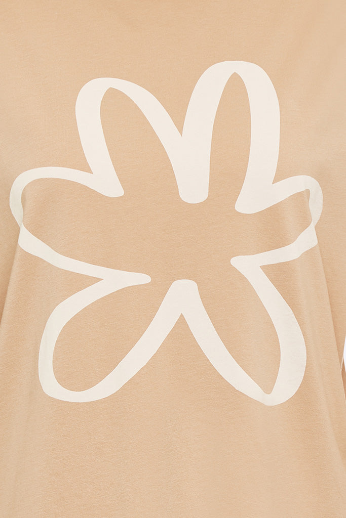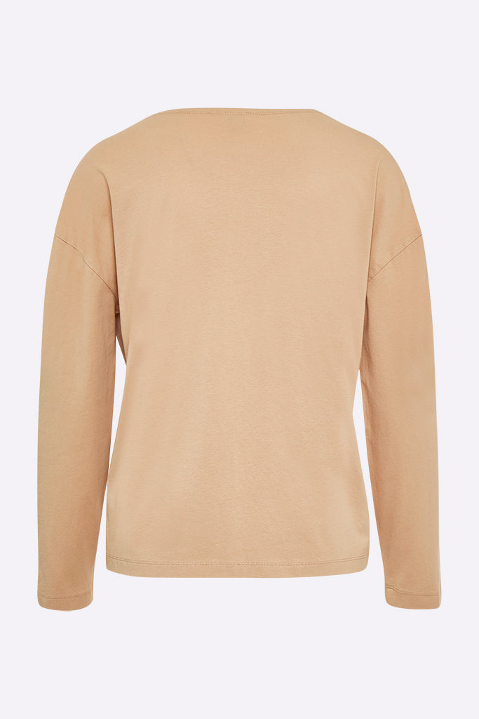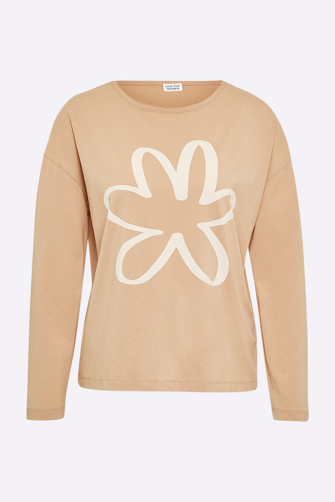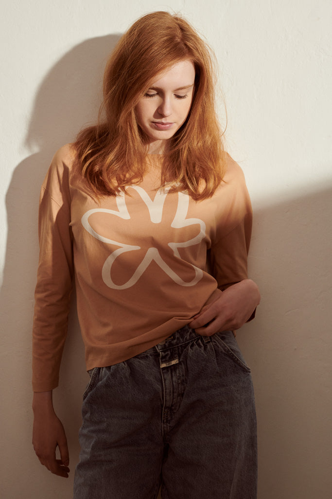 Das Toni longsleeve ist ein weit geschnittenes longsleeve mit niedrig angesetzter Schulter. Es ist aus bronze farbenem Bio-Baumwoll Jersey gefertigt und hat einen Blumenprint auf der Brust.